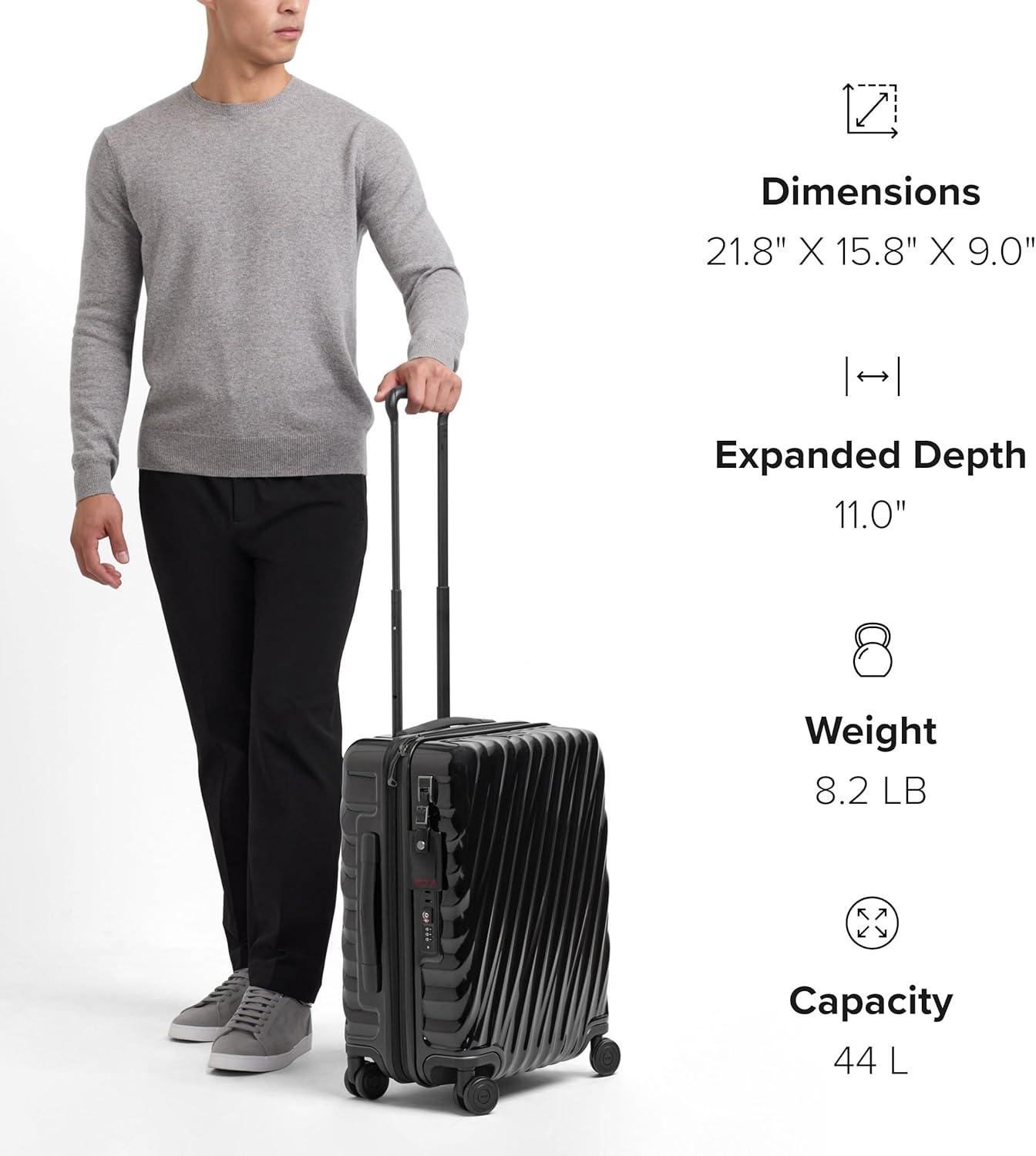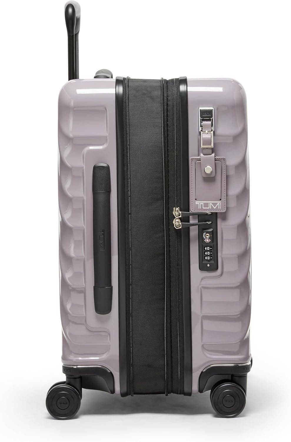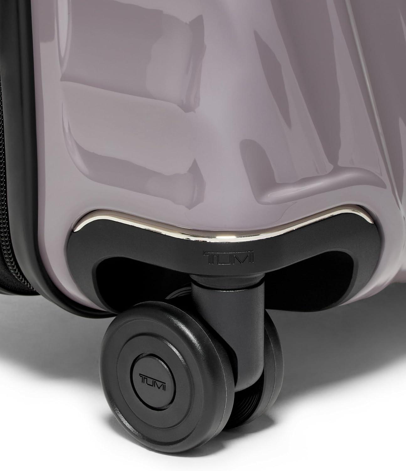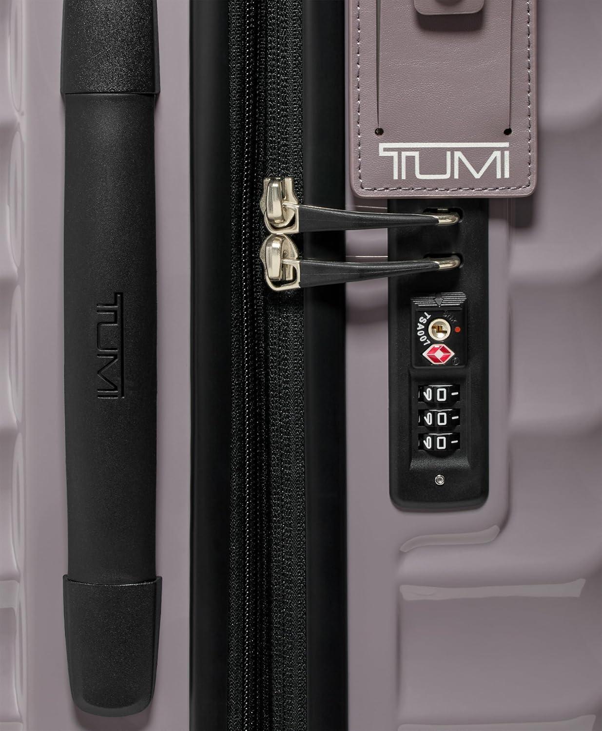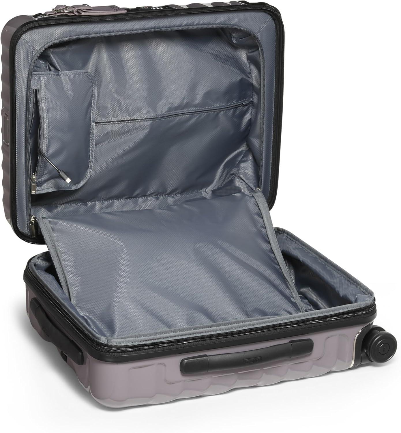 Travel comfortably and in style with the TUMI 19 Degree Continental Expandable 4-Wheel Carry-On. This sleek carry-on bag is the perfect companion for the modern traveler. Designed with a durable recycled polycarbonate shell, it effortlessly combines a lightweight build with the strength needed for both international travel and domestic jaunts. The distinctive silhouette and fluid contours ensure that your luggage stands out with an understated elegance.Your clothes and travel essentials are secure and organized within the spacious interior, featuring zip pockets, compression straps, and dual-compartment zip pockets for easy separation of items. For those who carry more, the zipper expansion allows for additional space while maintaining the bag's streamlined profile.On the exterior, our USB port supports up to 65W USB 2.0 cables, and fast charging up to 65W 3A. The innovative spinner wheels provide a smooth and reliable glide, making navigation through bustling airports a breeze. The grab handle, along with the retractable top and side carry handles, ensures multiple carrying options tailored to your comfort and convenience.TUMI’s commitment to excellence is evident in every feature of this carry-on luggage. The integrated TSA lock secures your belongings without hindering inspections. With TUMI’s signature attention to detail, this rolling carry-on is not just a luggage bag—it’s an indispensable travel tool for those who seek performance and style in one package.We design for you. Our commitment to exceptional quality and high performing products have made TUMI the leading lifestyle and accessories brand that travelers depend on consistently. This is what we call the TUMI Difference.By putting excellence and quality first, we are committed to creating quality TUMI products that have lifelong purpose, are supported by our rigorous testing standards, use recycled materials and our global repair network.