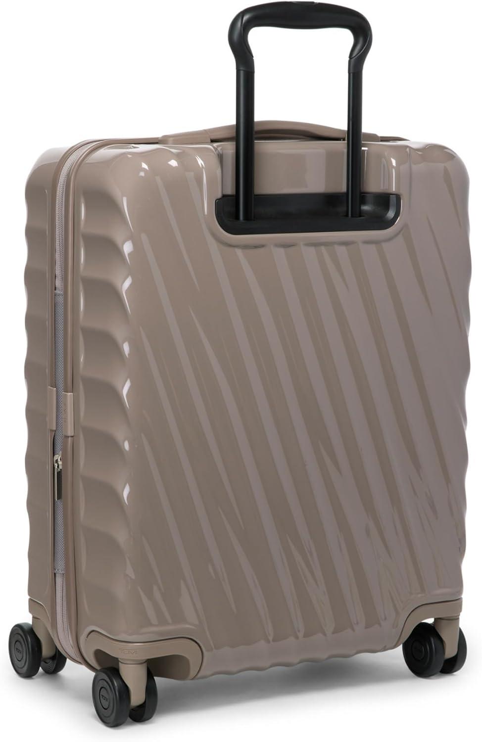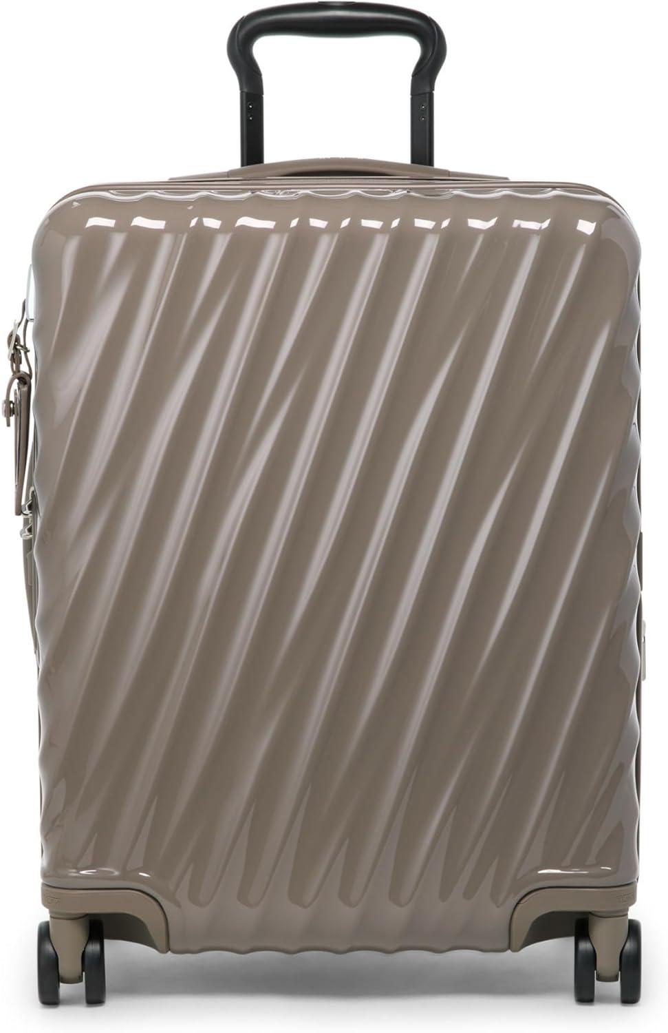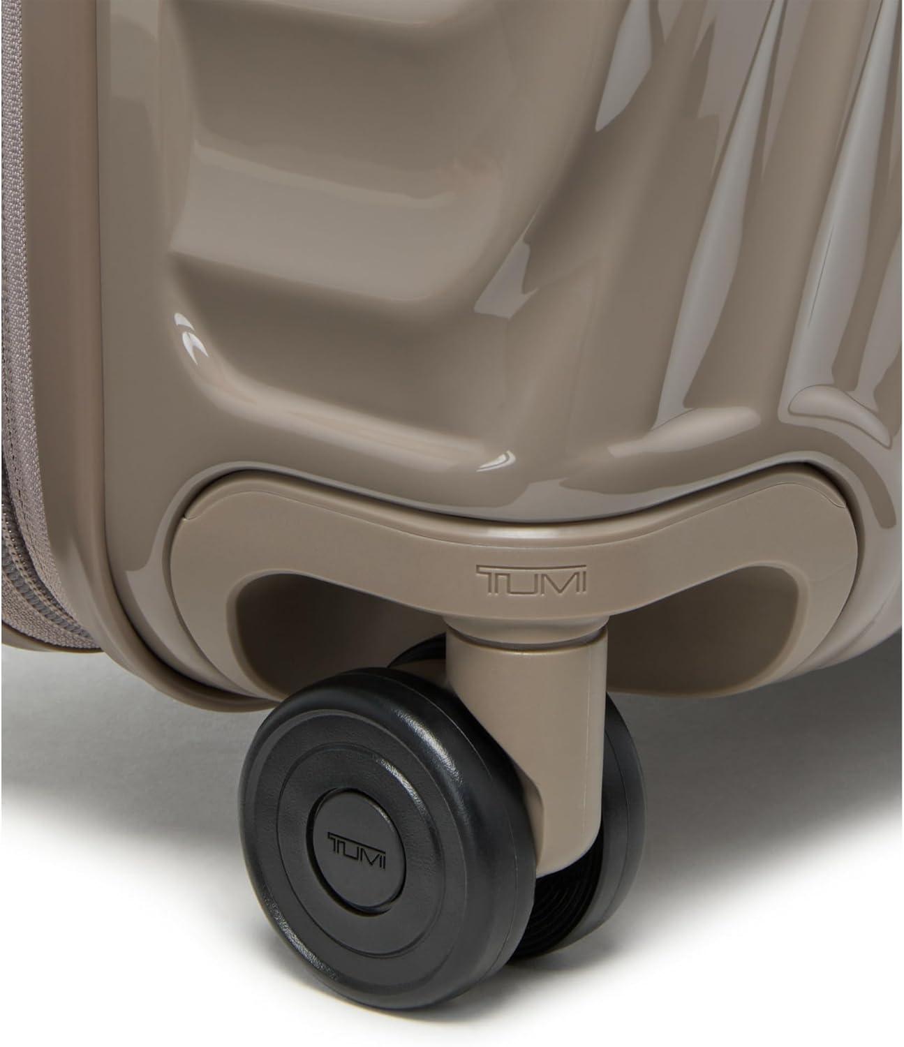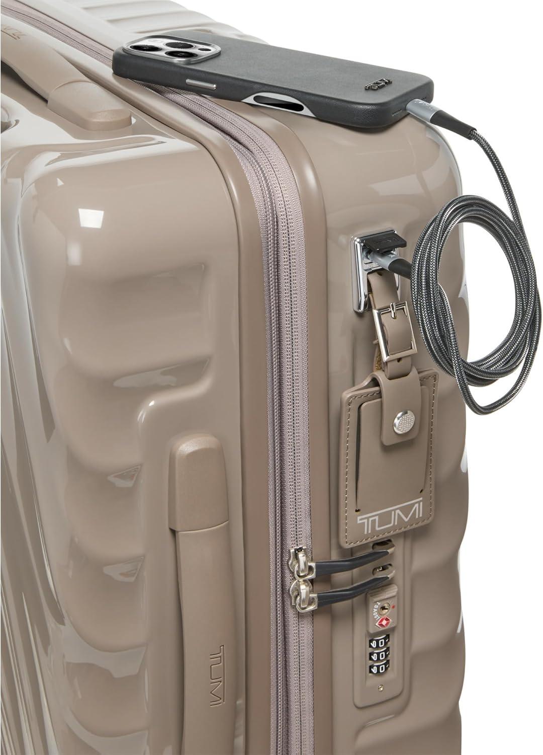 Travel comfortably and in style with the TUMI 19 Degree Continental Expandable 4-Wheel Carry-On. This sleek carry-on bag is the perfect companion for the modern traveler. Designed with a durable recycled polycarbonate shell, it effortlessly combines a lightweight build with the strength needed for both international travel and domestic jaunts. The distinctive silhouette and fluid contours ensure that your luggage stands out with an understated elegance.Your clothes and travel essentials are secure and organized within the spacious interior, featuring zip pockets, compression straps, and dual-compartment zip pockets for easy separation of items. For those who carry more, the zipper expansion allows for additional space while maintaining the bag's streamlined profile.On the exterior, our USB port supports up to 65W USB 2.0 cables, and fast charging up to 65W 3A. The innovative spinner wheels provide a smooth and reliable glide, making navigation through bustling airports a breeze. The grab handle, along with the retractable top and side carry handles, ensures multiple carrying options tailored to your comfort and convenience.TUMI’s commitment to excellence is evident in every feature of this carry-on luggage. The integrated TSA lock secures your belongings without hindering inspections. With TUMI’s signature attention to detail, this rolling carry-on is not just a luggage bag—it’s an indispensable travel tool for those who seek performance and style in one package.We design for you. Our commitment to exceptional quality and high performing products have made TUMI the leading lifestyle and accessories brand that travelers depend on consistently. This is what we call the TUMI Difference.By putting excellence and quality first, we are committed to creating quality TUMI products that have lifelong purpose, are supported by our rigorous testing standards, use recycled materials and our global repair network.