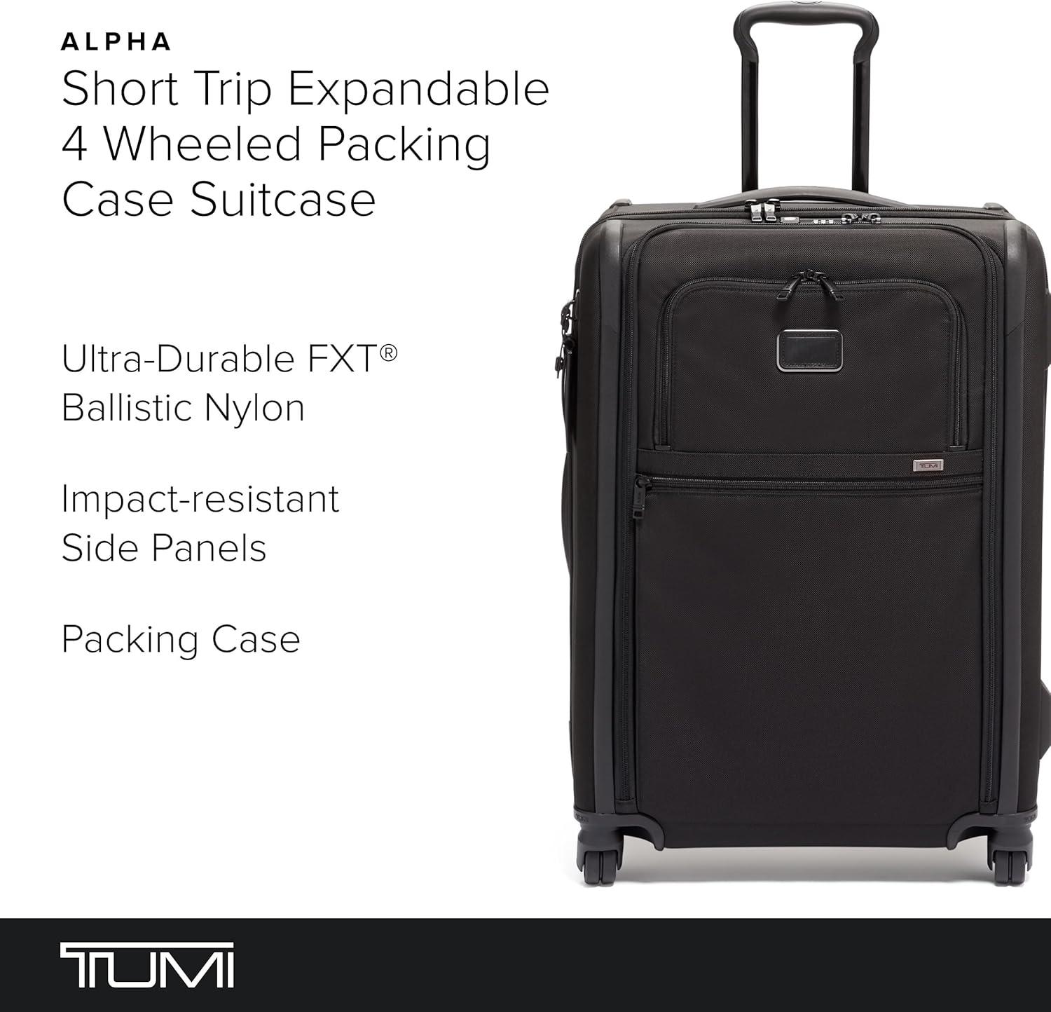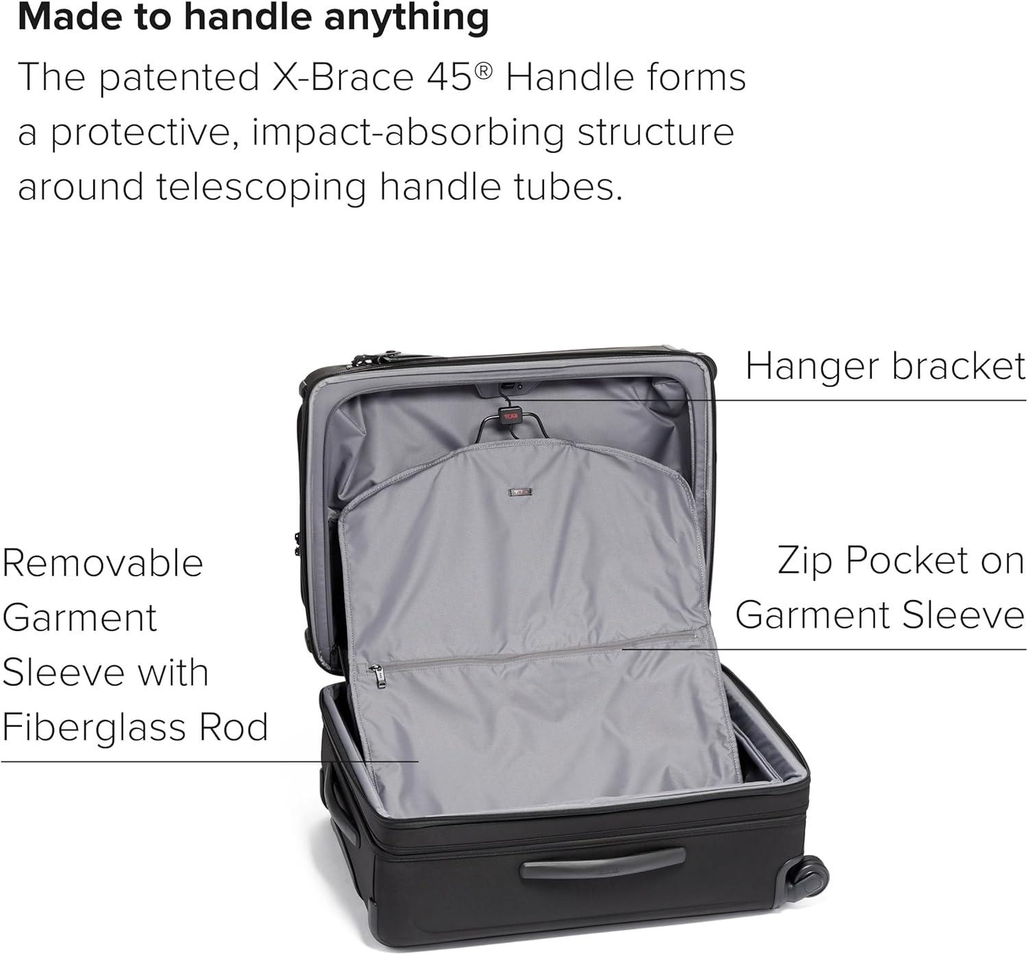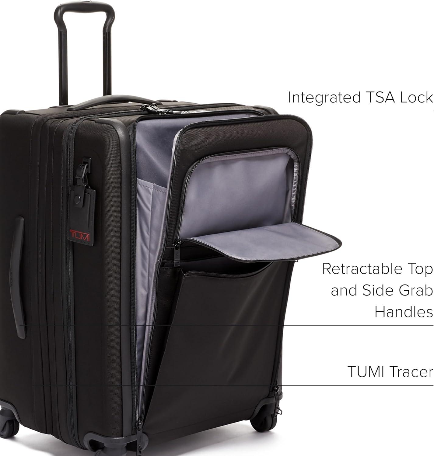 TUMI Alpha has evolved, featuring improved design details, updated functionality and enhanced performance. Built for professionals and frequent travelers who value quality and efficiency. Alpha is engineered to perform, featuring maximum durability and unparalleled functionality. Travel confidently with the TUMI Alpha Medium Dual Access Expandable Checked Luggage, a large-capacity suitcase built for travelers who demand more from every journey. Designed with a streamlined aesthetic, this expandable checked luggage is crafted from TUMI’s signature FXT Ballistic Nylon with a recycled lining, delivering exceptional durability and elevated performance for extended trips. Engineered for smarter packing, this dual-access suitcase features a dual zip entry to the main compartment and a front U-zip pocket for quick access to essentials. A lever-lock two-stage expansion provides added capacity when needed. Interior organization includes two zip pockets, a mesh zip pocket, an open pocket, compression straps, and a zip divider separating front and back compartments. A hanger bracket (hanger sold separately) and an integrated AirTag pocket add convenience and peace of mind. Smooth maneuverability comes from four dual outboard wheels paired with a three-stage telescoping handle. Retractable top and side grab handles, a bottom grab handle, and four side feet make lifting and handling easier, while molded, impact-resistant side panels provide added protection. This expandable checked suitcase includes a built-in dual TSA combination lock and TUMI Tracer, helping reunite you with your luggage if it’s ever lost. We design for you. Our commitment to exceptional quality and high-performing products has made TUMI the leading lifestyle and accessories brand that travelers depend on consistently. This is what we call the TUMI Difference.