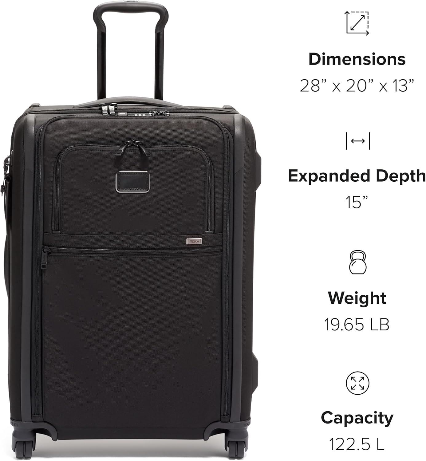 TUMI Alpha has evolved, featuring improved design details, updated functionality and enhanced performance. Built for professionals and frequent travelers who value quality and efficiency. Alpha is engineered to perform, featuring maximum durability and unparalleled functionality. Travel confidently with the TUMI Alpha Medium Dual Access Expandable Checked Luggage, a large-capacity suitcase built for travelers who demand more from every journey. Designed with a streamlined aesthetic, this expandable checked luggage is crafted from TUMI’s signature FXT Ballistic Nylon with a recycled lining, delivering exceptional durability and elevated performance for extended trips. Engineered for smarter packing, this dual-access suitcase features a dual zip entry to the main compartment and a front U-zip pocket for quick access to essentials. A lever-lock two-stage expansion provides added capacity when needed. Interior organization includes two zip pockets, a mesh zip pocket, an open pocket, compression straps, and a zip divider separating front and back compartments. A hanger bracket (hanger sold separately) and an integrated AirTag pocket add convenience and peace of mind. Smooth maneuverability comes from four dual outboard wheels paired with a three-stage telescoping handle. Retractable top and side grab handles, a bottom grab handle, and four side feet make lifting and handling easier, while molded, impact-resistant side panels provide added protection. This expandable checked suitcase includes a built-in dual TSA combination lock and TUMI Tracer, helping reunite you with your luggage if it’s ever lost. We design for you. Our commitment to exceptional quality and high-performing products has made TUMI the leading lifestyle and accessories brand that travelers depend on consistently. This is what we call the TUMI Difference.