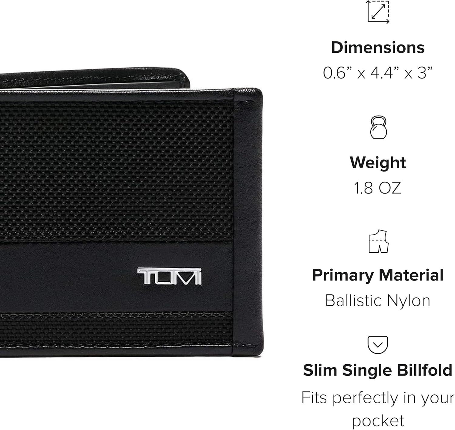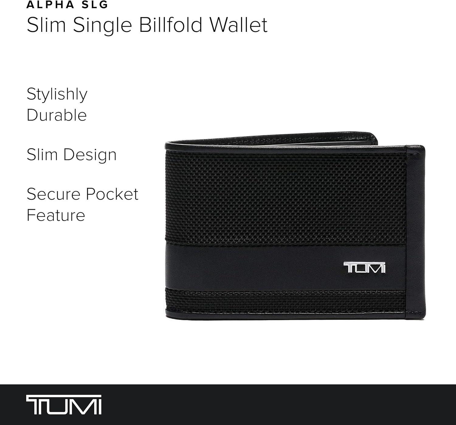 Premium Slim Wallet: The TUMI Alpha Slim Single Billfold wallet is expertly designed for durability and functionality, featuring a hidden card pocket for added security