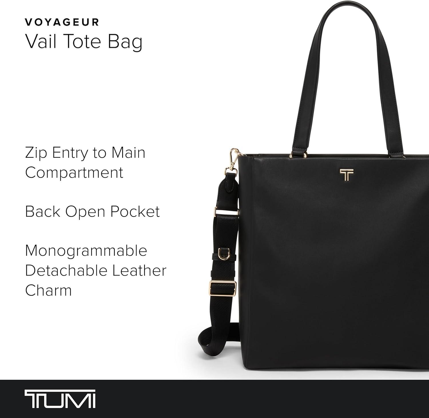 Travel comfortably and in style with the women's Voyageur Vail Leather Tote. Designed as the perfect tote bag for women, this elegant leather bag seamlessly blends sophistication with practicality. Whether heading to the office or exploring the city, the black tote offers ample space to carry all your essentials. The zip entry ensures easy access to the main compartment, while multiple zip pockets keep your belongings organized and secure. A dedicated phone pocket provides quick access to your device, making it perfect for the modern commuter. The padded laptop compartment with leather snap tab (fits up to a 15” PC or 16” MacBook screen) transforms this tote into a reliable laptop bag for your daily needs. Additionally, the water bottle pocket ensures you stay hydrated on the go. The back open pocket converts into an Add-a-Bag sleeve, so you can attach it to your luggage. Durable metal feet protect the bottom of the tote, while the microfiber-lined interior and pen pocket offer additional organization. Elevate your daily commute and travel adventures with this exquisite travel tote, designed to meet all your lifestyle needs. We design for you. Our commitment to exceptional quality and high performing products have made TUMI the leading lifestyle and accessories brand that travelers depend on consistently. This is what we call the TUMI Difference. By putting excellence and quality first, we are committed to creating quality TUMI products that have lifelong purpose, are supported by our rigorous testing standards, use recycled materials and our global repair network.