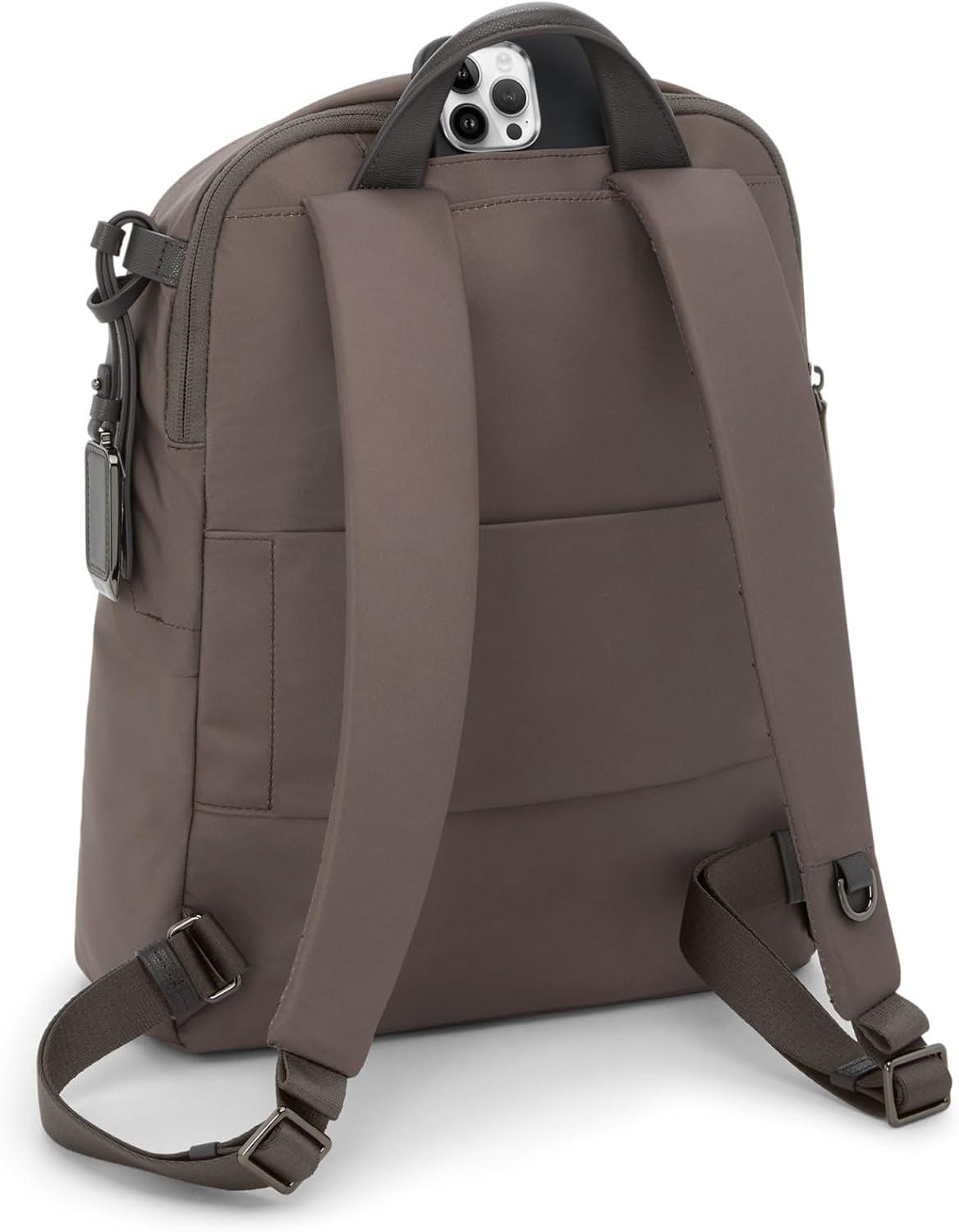 Quick-access phone pocket| Padded adjustable backpack straps with D-ring and loop compatible with select TUMI+ accessories| Monogrammable detachable leather charm| Add-a-Bag strap| Sold separately